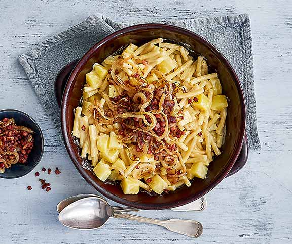 Một loại mì ống cùng với khoai tây, phô mai và hành tây, tạo nên một món ăn truyền thống ngon miệng.